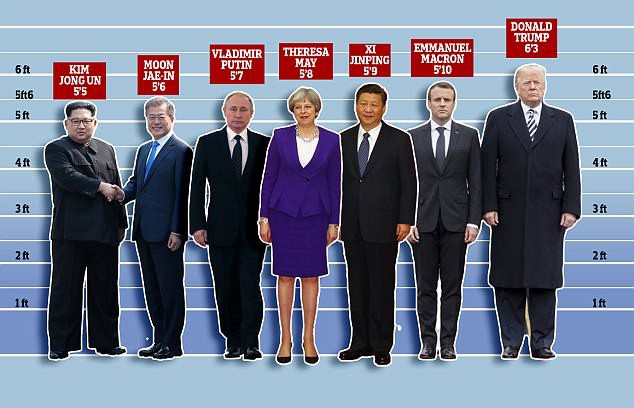 Bảng so sánh chiều cao của ông Kim Jong-un và lãnh đạo các nước Hàn Quốc, Nga, Anh, Trung Quốc, Pháp và Mỹ. Ảnh: Daily Mail.